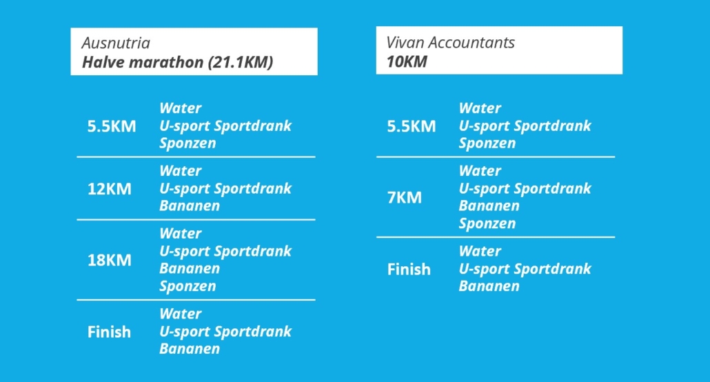 Tijdens de Ned Air 2Bruggenloop zijn er afhankelijk van de afstand die je loopt één of meerdere drankposten onderweg met water, sportdrank van U-Sport, bananen en sponzen. Bij de finish zal er voor alle afstanden water, sportdrank van U-Sport en bananen aanwezig zijn voor alle deelnemers.